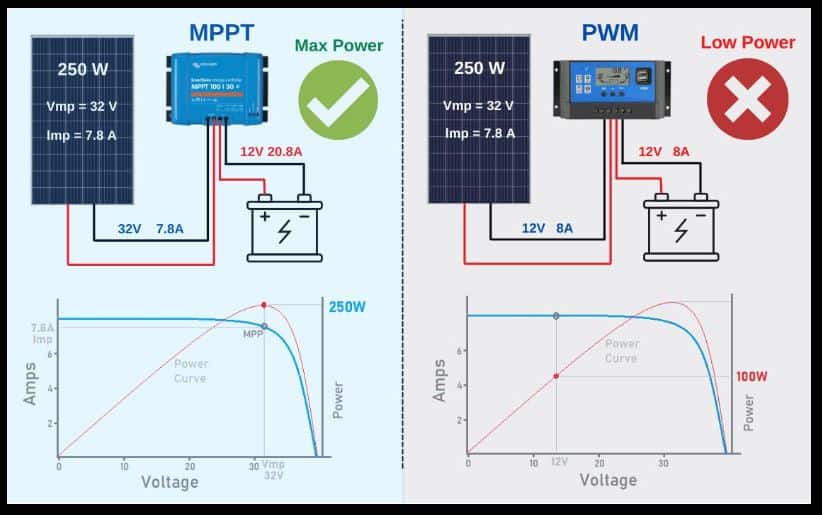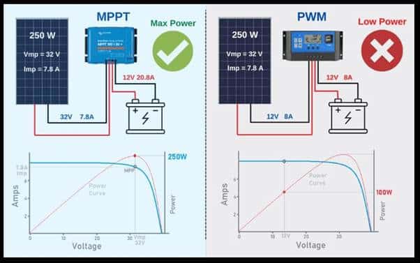 MPPT controllers continuously track the maximum power point of your solar panels and convert excess voltage into usable current.